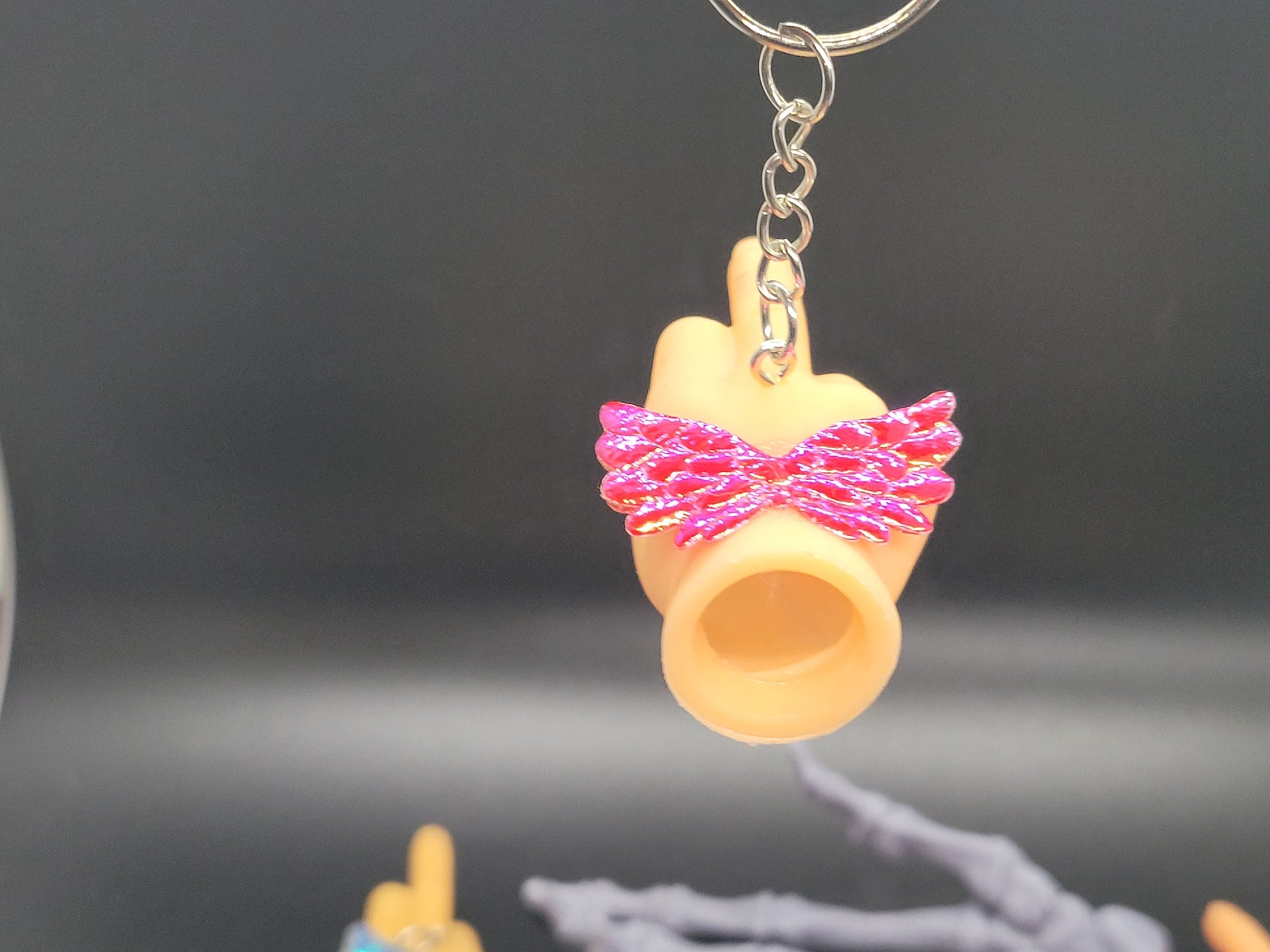 Got to love a flying finger. Several options available. Color is sent at random. Can try to honor wing color requests. 3 inches of soft vinyl on a key chain. Sold individually.