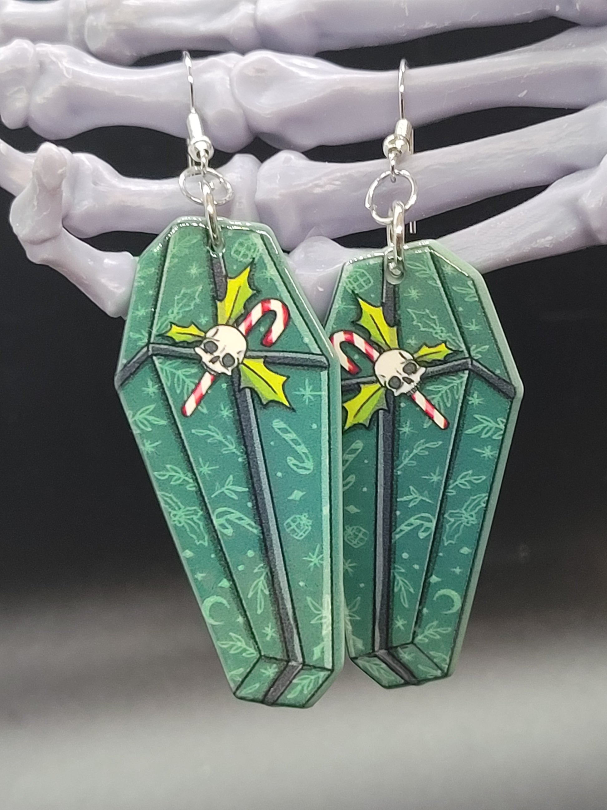 These's stunning flat acrylic dangle earrings are made using thicker grade acrylic, printed on both sides. They come on a hook style earwire. They measure approximately 2 in long by 1.25 inches wide. They are lightweight which is nice for those with sensitive ears. Add some festive bling to your holiday outfit today.