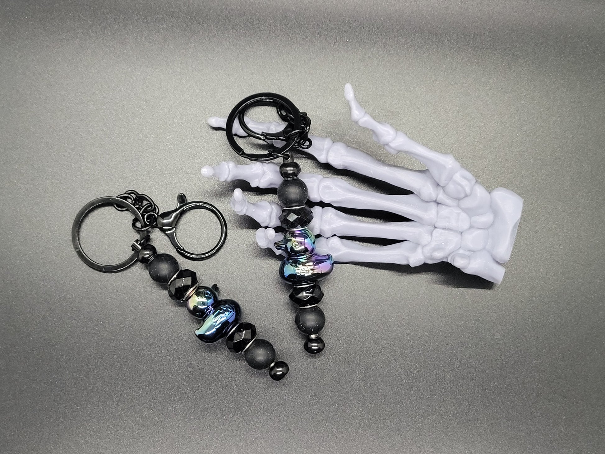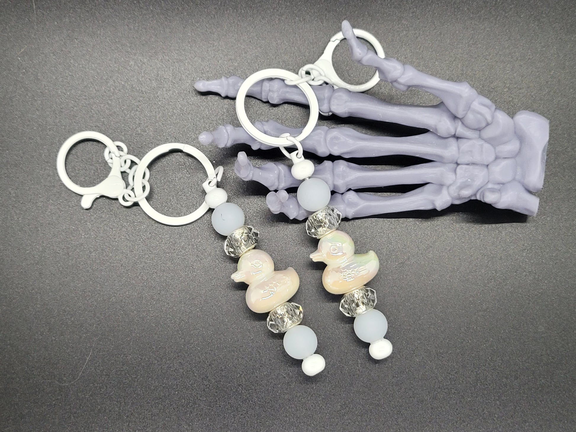 These key chains are hand beaded with these cute Jeep/ Peep beads. Mix of acrylic, and silicone beads. They measure 4 inches long. With a metal hook and split ring. Sold individually in your choice of color.