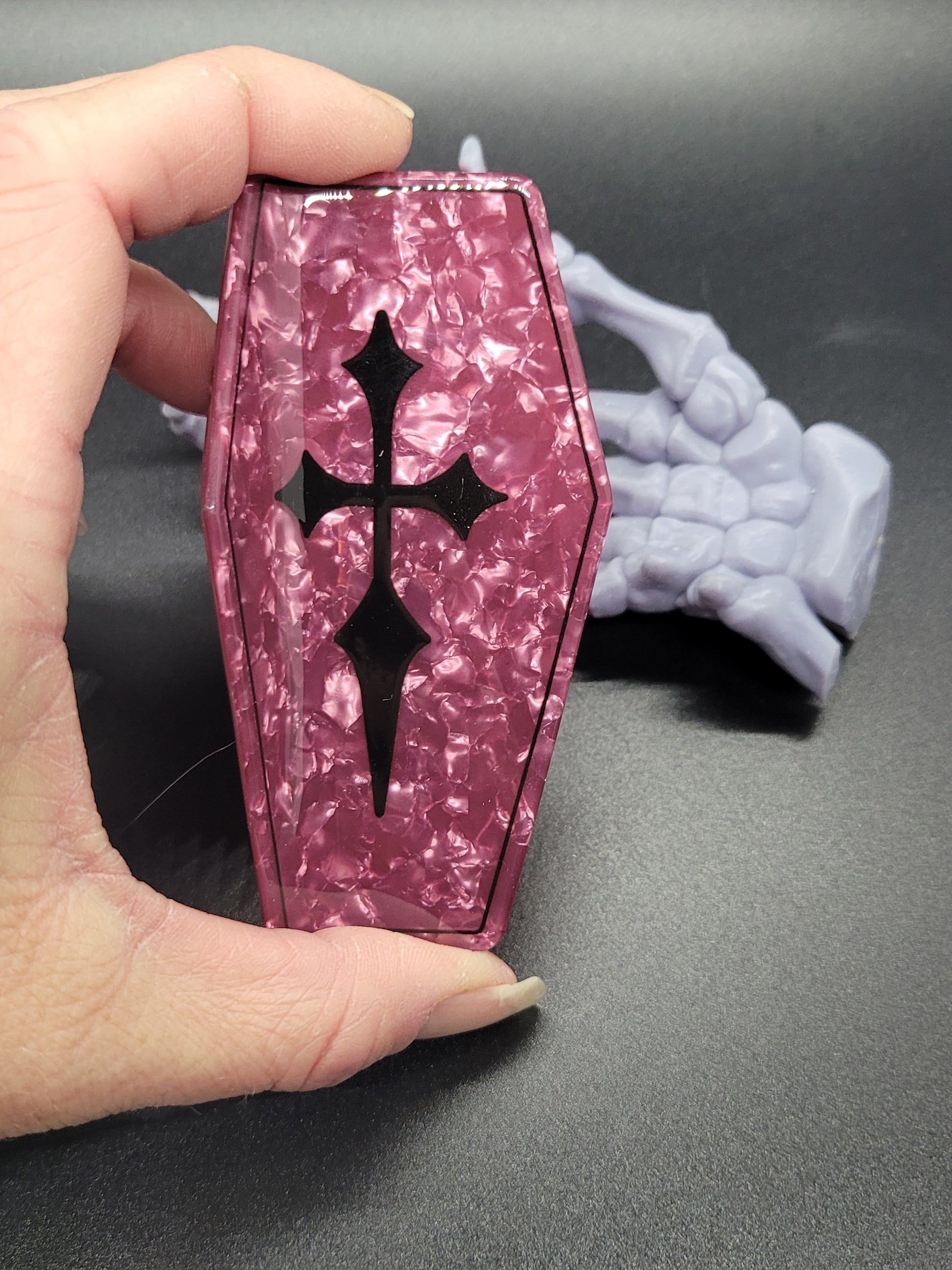 This stunning hair clip is made with acrylic in the shape of a coffin. It has a nice metal spring to grip onto your hair. Measures about 4 in Long 2 and 1/2 in wide. Sold individually