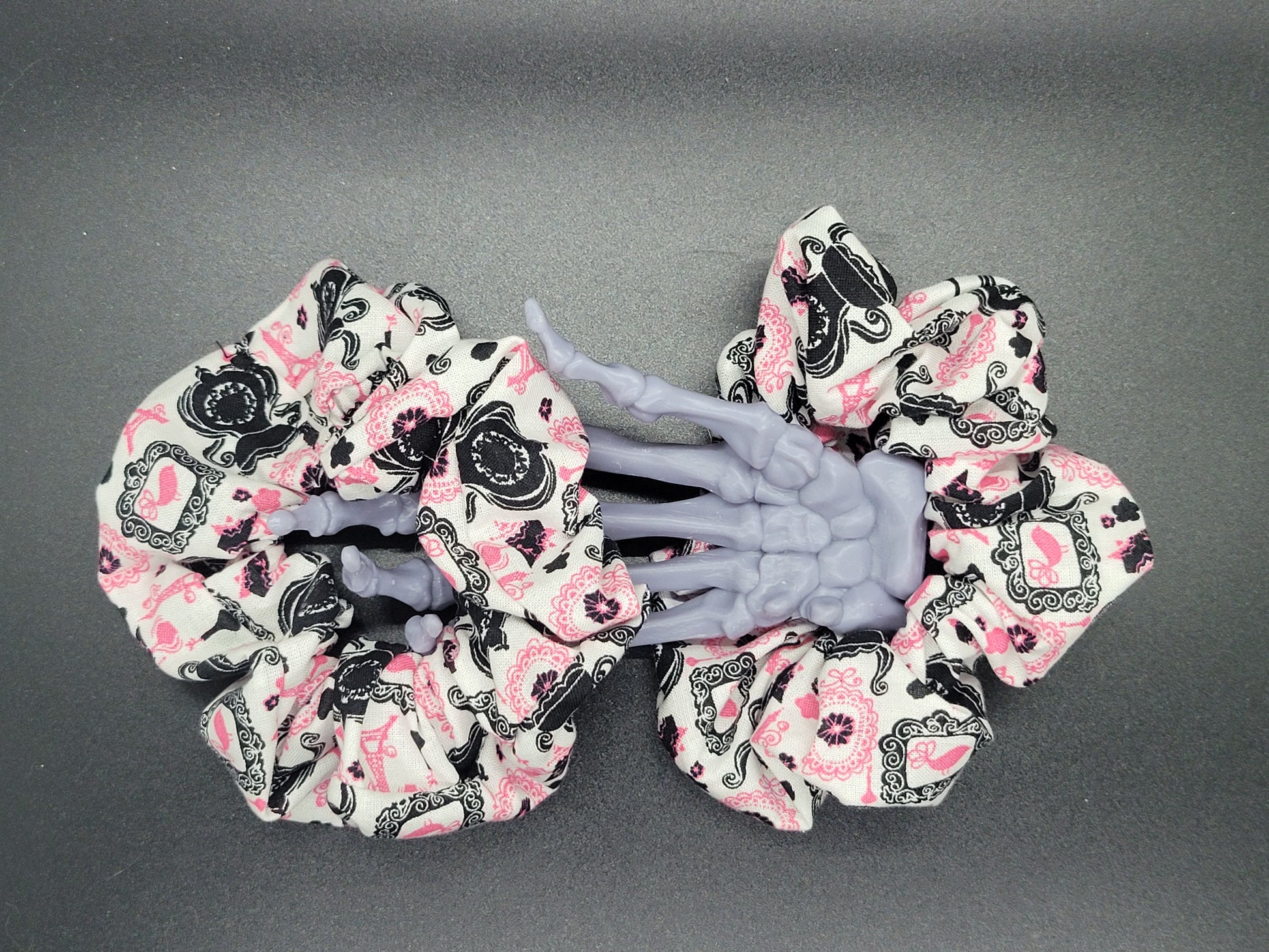 Our handmade hair scrunchies are 100% cotton with a heavy braid elastic inside. They are washable we do recommend hang dry to keep the elastic stretchy for as long as possible. Some of the scrunchies we have had out there have been in use for five six years and still holding just as well as they did brand new. We use approximately 7 in of braid elastic so stretched you get plenty of room to twist it around your hair.